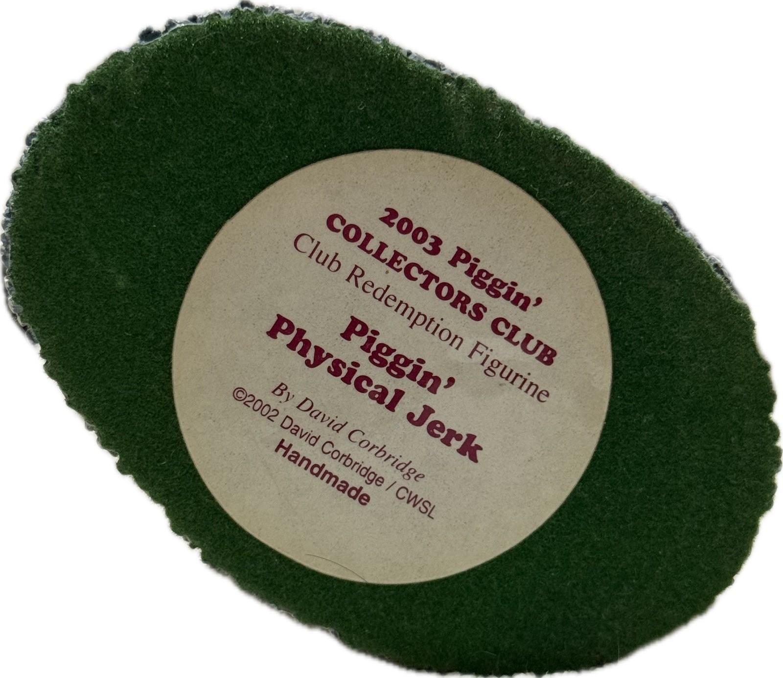 A charming handmade ceramic pig figurine from the beloved Piggin collection by renowned UK artist David Corbridge. This 2002 'Physical Jerk' design features a fitness-focused pig character working out.